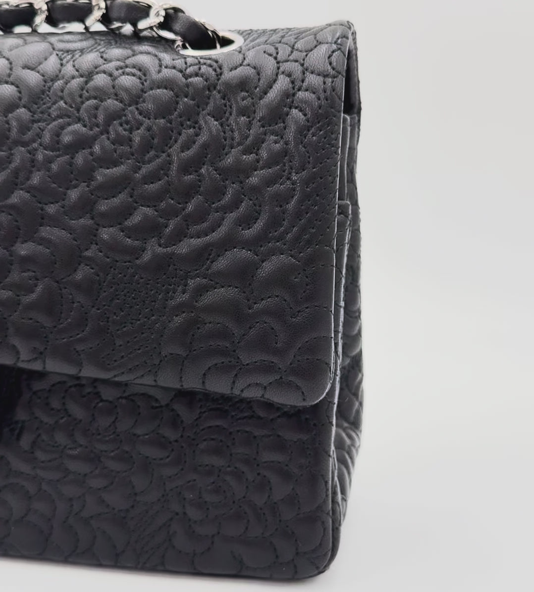 Selective Closet vous présente ce magnifique Chanel Double Flap Medium en cuir d’agneau, magnifiquement orné de délicates camélias brodées.